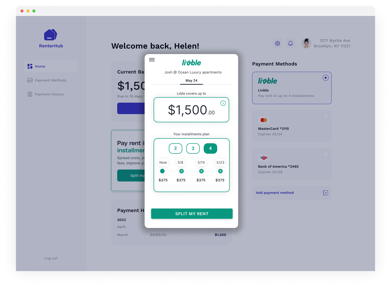 The Livble Experience is a smart overlay modal where all the Lvble user flow happens. Once popped up, the tenant will see a new modal on top of the tenant portal where they can go over Livble's onboarding, split rent and repay flows.