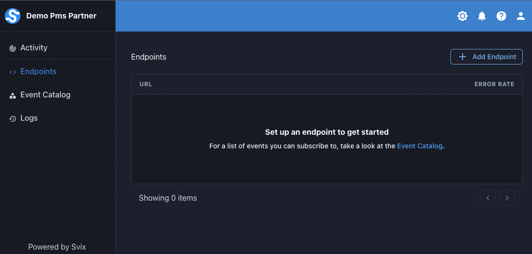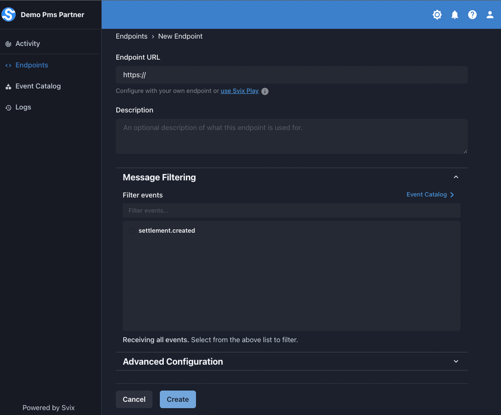 In the "Endpoints" tab you can create a new endpoint in order to subscribe to an event from the catalog: